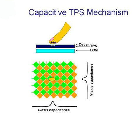 電容式觸控面板在結(jié)構(gòu)上最外層為一薄薄的二氧化硅硬化處理層,第二層為ITO薄膜,這兩片具備特定透明導(dǎo)電圖型的透明薄片,互相不導(dǎo)通,當使用者手指接近面板時,分別負責感應(yīng)X軸及Y軸的電容變化,并經(jīng)由控制電路以序列或平行的方式,讀取手指觸摸面板的位置。面板的最下層還有一層ITO薄膜,提供遮蔽功能,以維持Touch Panel能在良好無干擾的環(huán)境下工作。