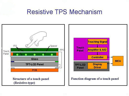 電阻式觸控面板是最常見的一種觸控面板,是由二片具備導(dǎo)電能力的透明ITO薄膜以及ITO玻璃貼合而成,其導(dǎo)電面相對,中間以多個整齊排列的透明間隔點將其隔開。當使用者以手指或觸控筆進行操作時,上下導(dǎo)電薄膜因為受到壓力,上方薄膜受到壓力時,即和下方ITO玻璃接觸,導(dǎo)電產(chǎn)生一分壓電流,并經(jīng)由控制器測知面板電壓變化而計算出接觸點位置以進行輸入。