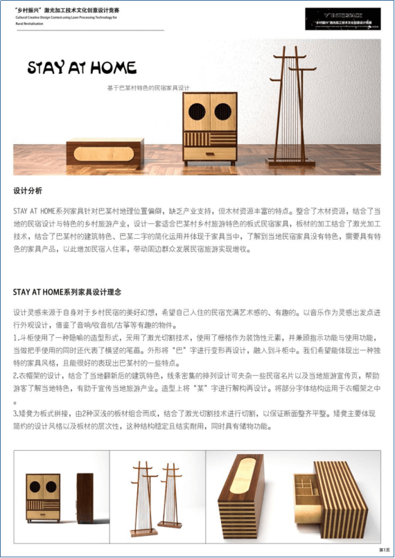 AT HOME系列家具針對(duì)巴某村地理位置偏僻、缺乏產(chǎn)業(yè)支持,但木材資源豐富的特點(diǎn),整合了木材資源,結(jié)合了當(dāng)?shù)氐拿袼拊O(shè)計(jì)與特色的鄉(xiāng)村旅游產(chǎn)業(yè),設(shè)計(jì)一套適合巴某村鄉(xiāng)村旅游特色的板式民宿家具。板材的加工結(jié)合了激光加工技術(shù)、巴某村的建筑特色和“巴某”二字的簡(jiǎn)化,運(yùn)用并體現(xiàn)于家具當(dāng)中。以此增加民宿入住率,帶動(dòng)周邊群眾發(fā)展民宿旅游實(shí)現(xiàn)增收。